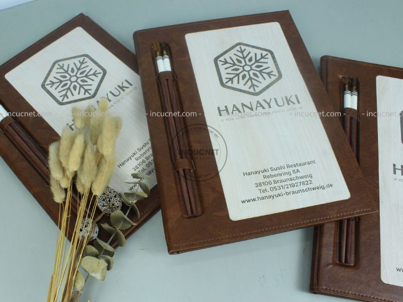 Cùng với ưu điểm là giá thành mềm hơn so với da thật. Kết hợp với quá trình gia công ép kim, dập chìm logo làm cho menu càng thêm nổi bật.