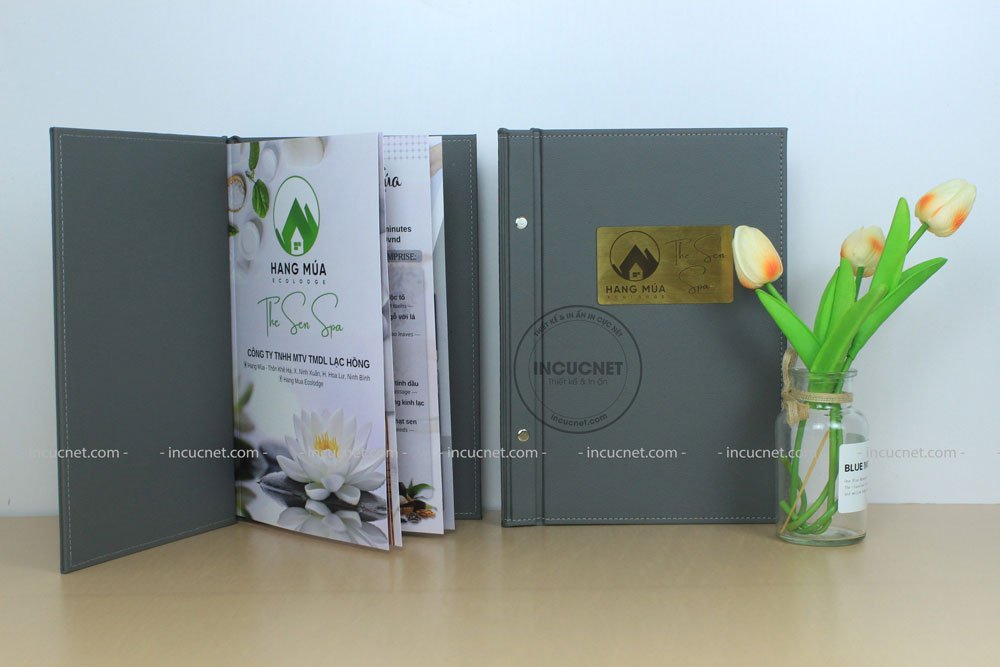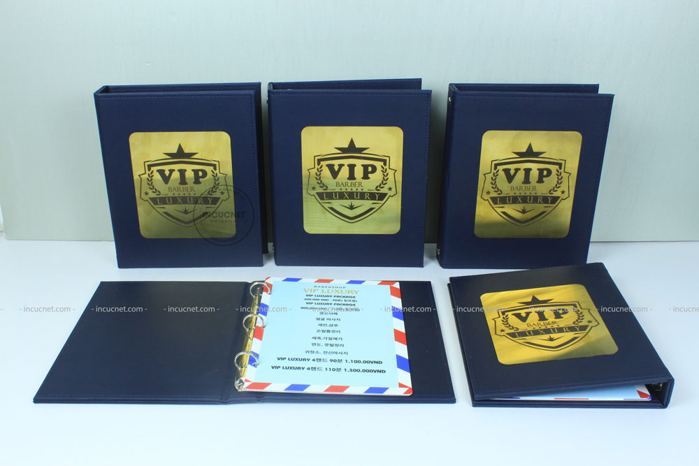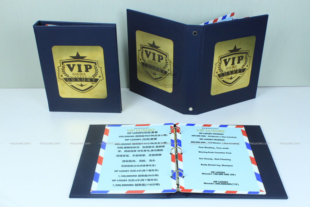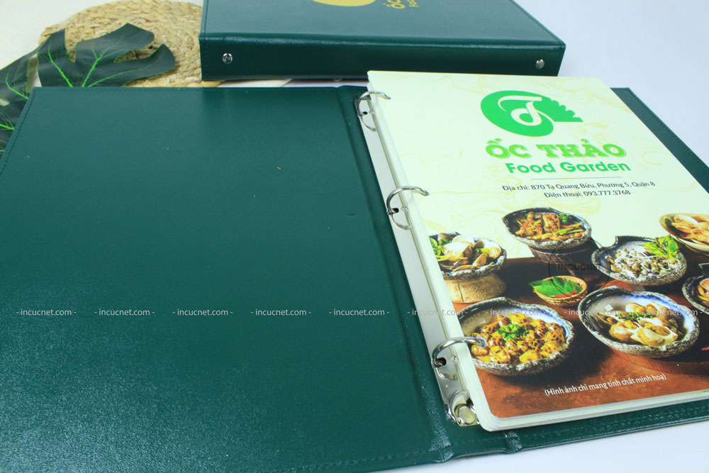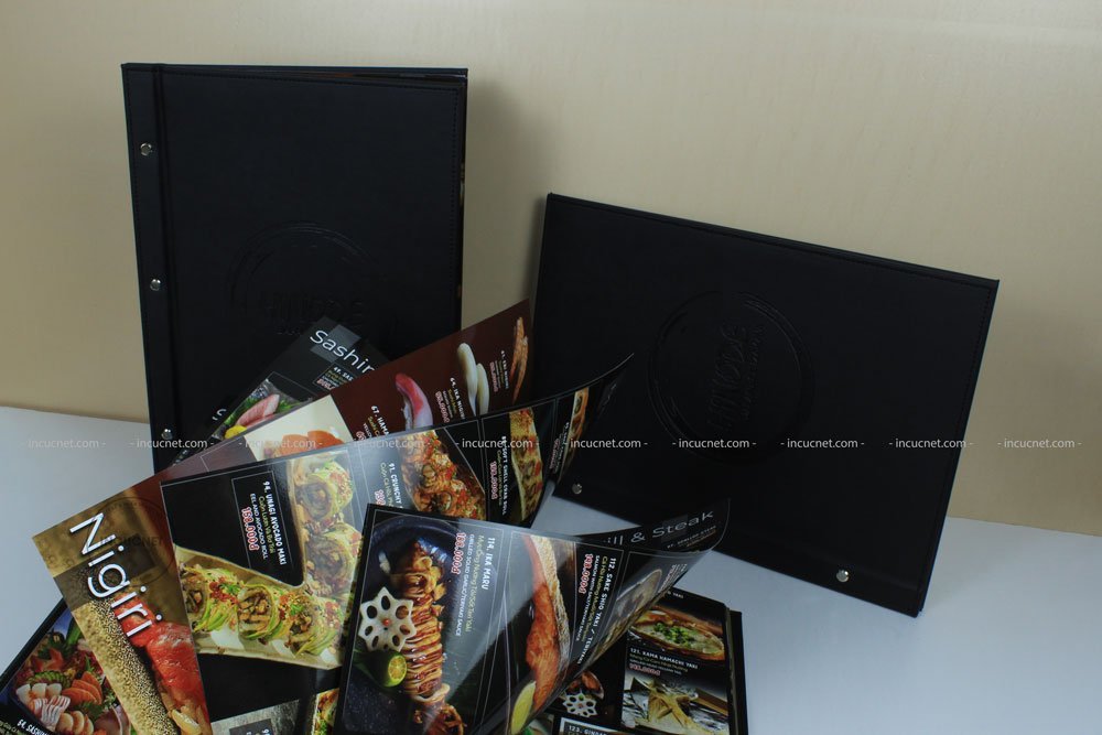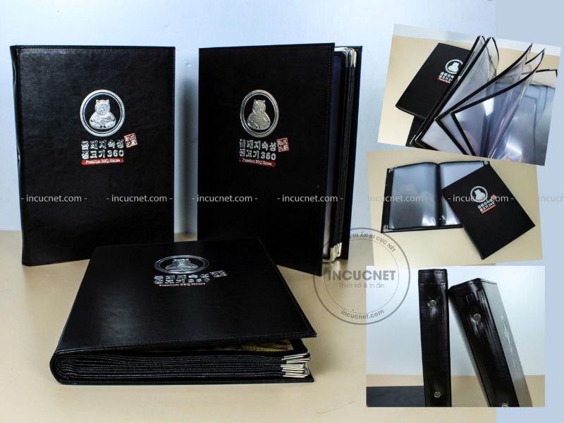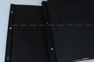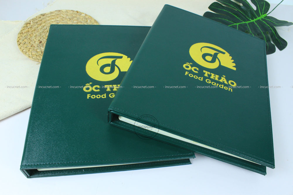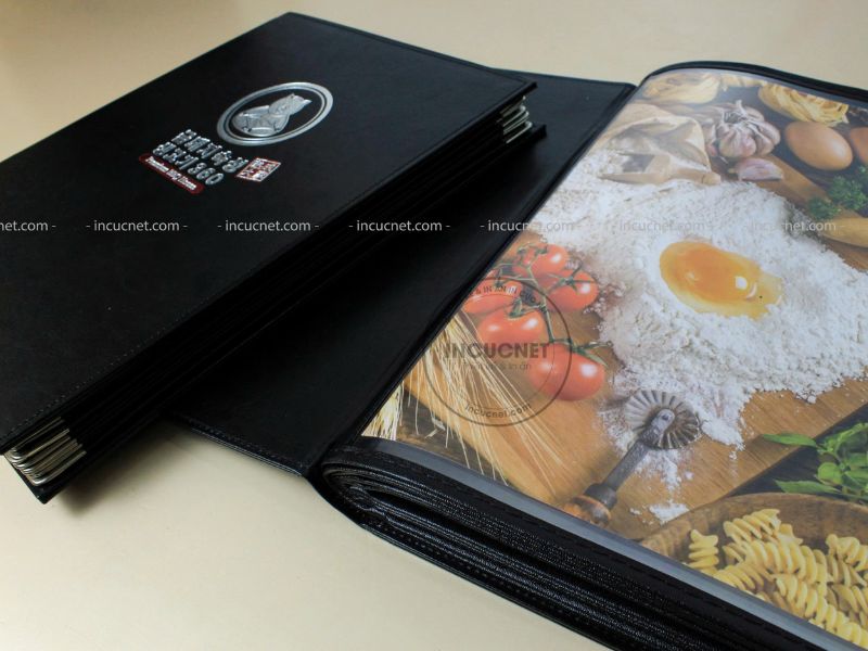 Các mẫu thức đơn bìa da, được trang trí bằng in dập nổi tên của nhà hàng. Góp phần tạo ấn tượng không nhỏ với khách hàng khi họ đến dùng bữa. Bất kể phong cách của nhà hàng là gì, quyển menu bìa da luôn là điểm nhấn quan trọng.