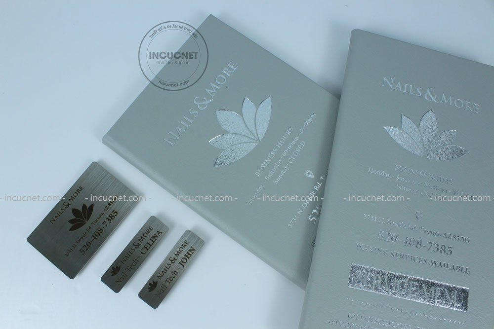 Logo inox kim loại làm cho bìa menu trở nên lôi cuốn và thường là một tác phẩm nổi bật. Các kiểu logo khác như dập nổi, dập chìm cũng mang đến một vẻ nổi bật và sang trọng.