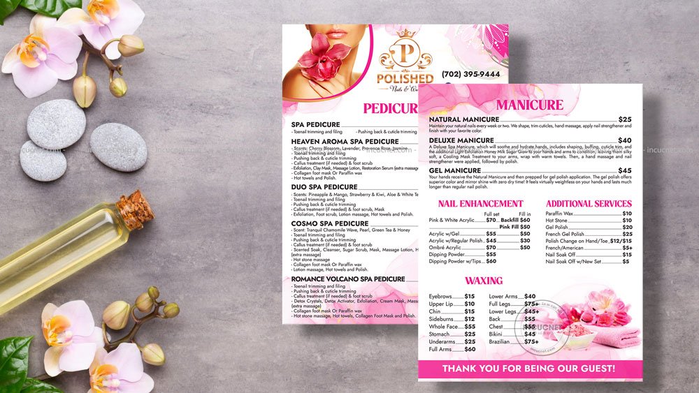 Quý khách có nhu cầu đặt làm menu Tiếng Anh nói chung. Menu nail bar, nails spa, nhà hàng, cafe,… nói riêng. Vui lòng liên hệ với chuyên viên tư vấn để được hỗ trợ và giải đáp thắc mắc nhanh chóng nhất.